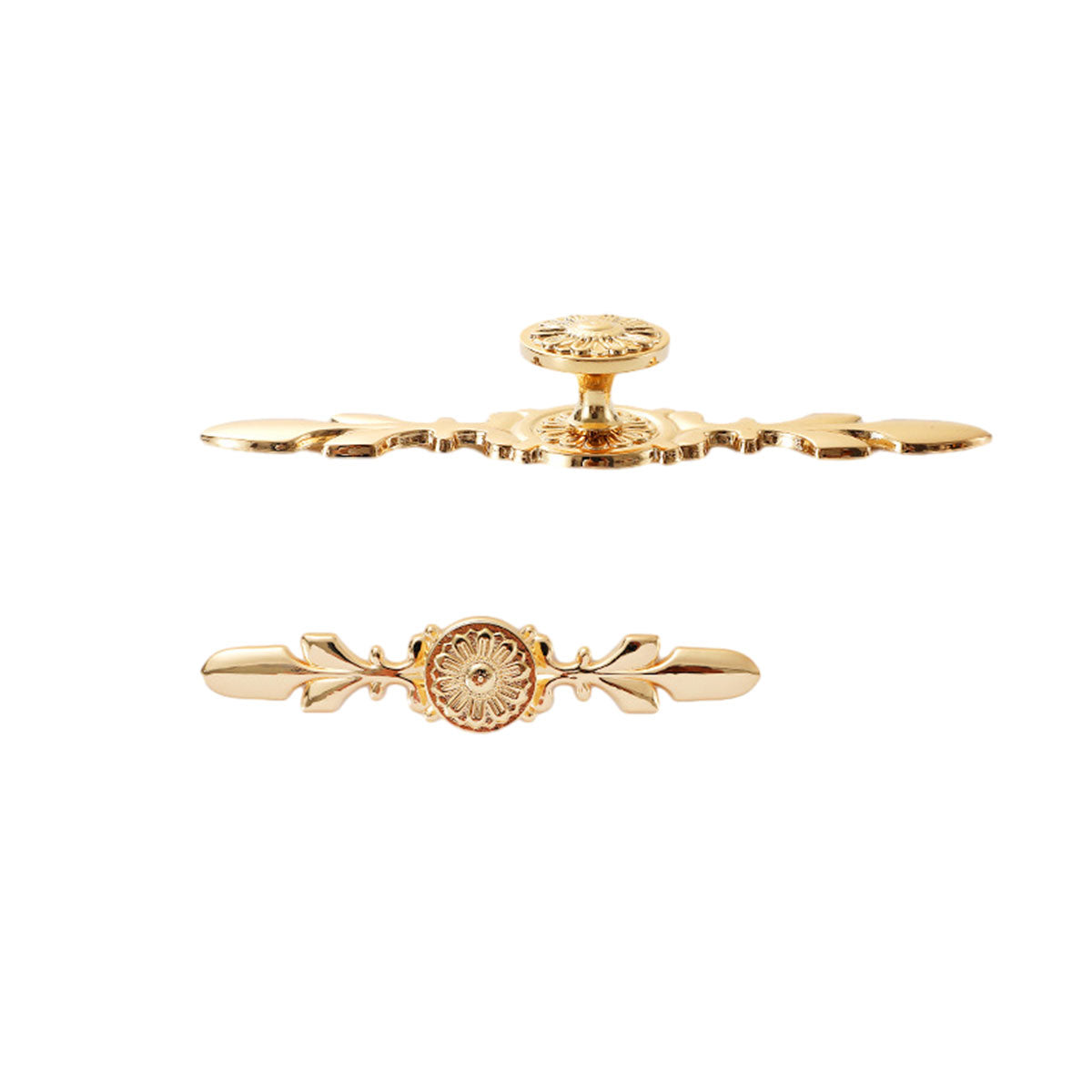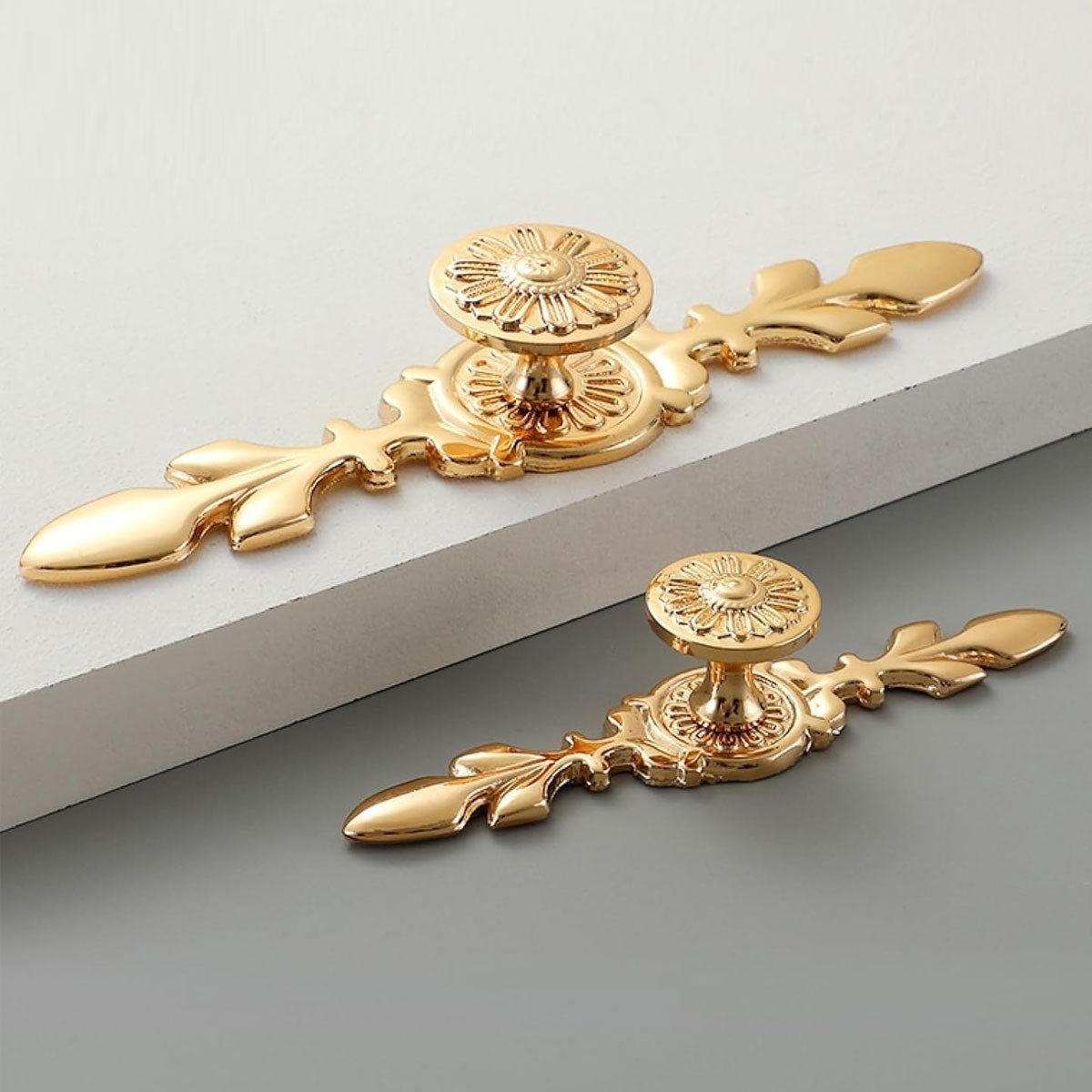 This elegant European-style handle features a vintage carved design with a lustrous gold finish, bringing a luxurious touch to any cabinet or wardrobe. Available in two styles (concave and flat) and sizes, it is perfect for wardrobes, cabinets, and wine cupboards, offering both decorative appeal and functionality.
