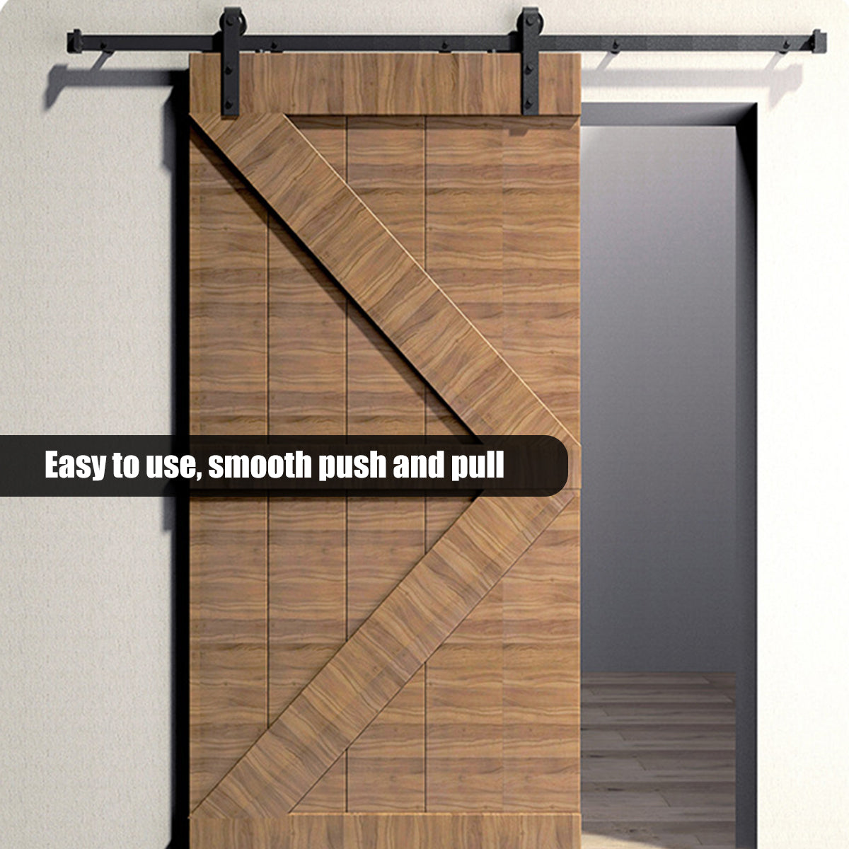 This J-type sliding barn door rail kit features high-strength carbon steel with a sleek black matte finish for durable, space-saving door operation. It supports smooth, quiet movement for bathrooms, kitchens, closets, and partitions.