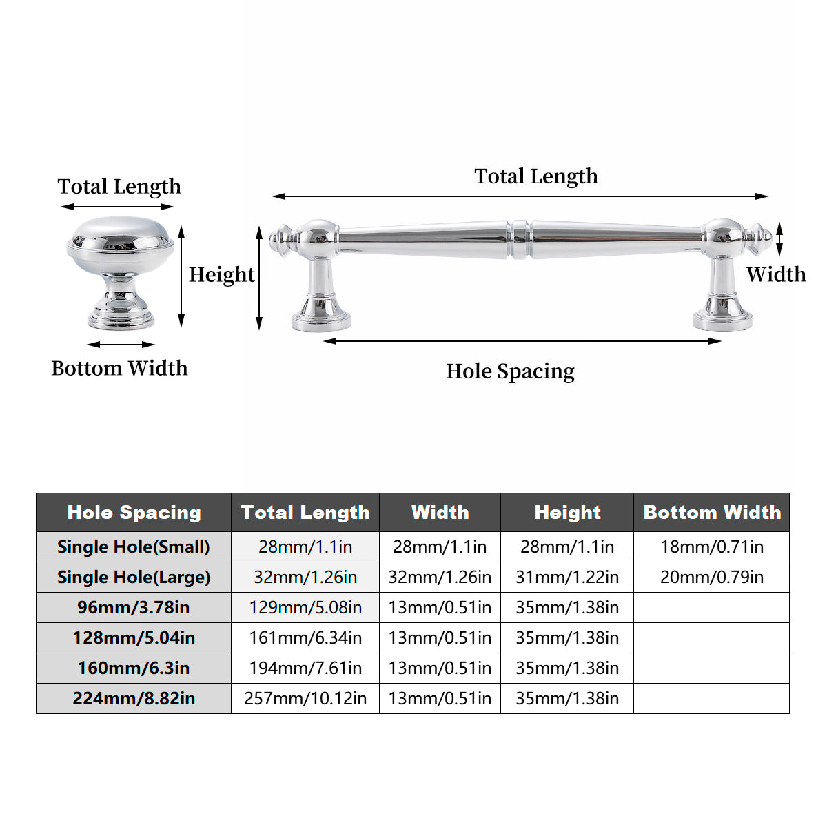 - Sizes Available (Hole spacing): 28mm / 1.1in; 32mm / 1.26in; 96mm / 3.78in; 128mm / 5.04in; 160mm / 6.3in; 224mm / 8.82in.